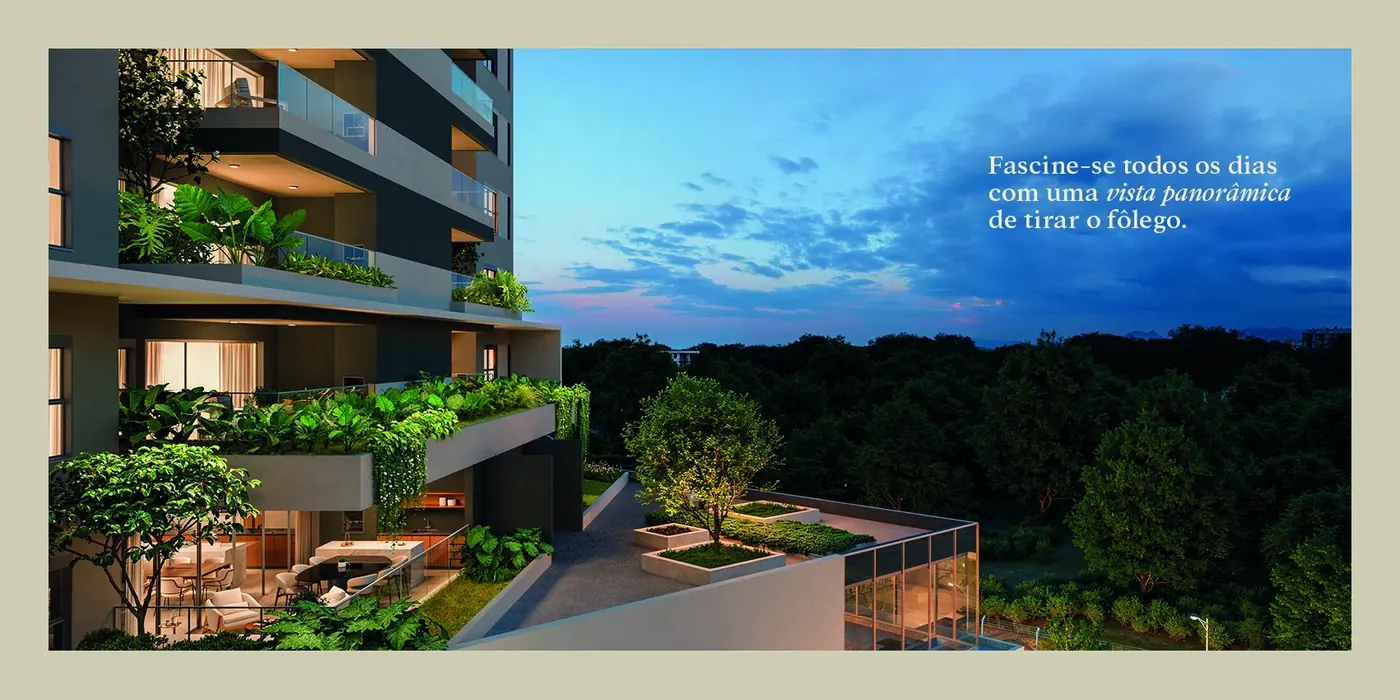 O desenho arquitetônico combina fachada contemporânea, brises e vegetação nas sacadas – leitura de biophilic design que valoriza bem-estar e fotografia impecável quando for vender ou locar.
